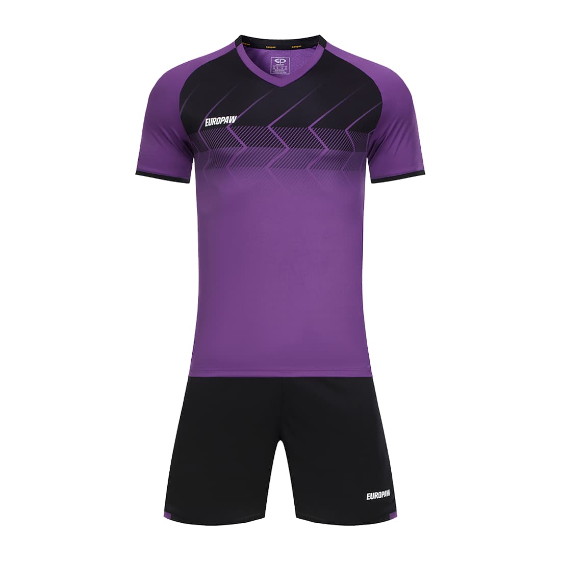 Футбольна форма Europaw 029 SLAVA у фіолетово-чорній гамі — стильний комплект командної екіпіровки для тренувань, офіційних матчів, занять у секціях та ДЮСШ. Глибокі темні відтінки виразно виглядають під прожекторами та на фото/відео, а практичні темні шорти менш вибагливі в догляді. У комплект входять футболка та шорти з легкої еластичної тканини, що відводить вологу і швидко висихає.