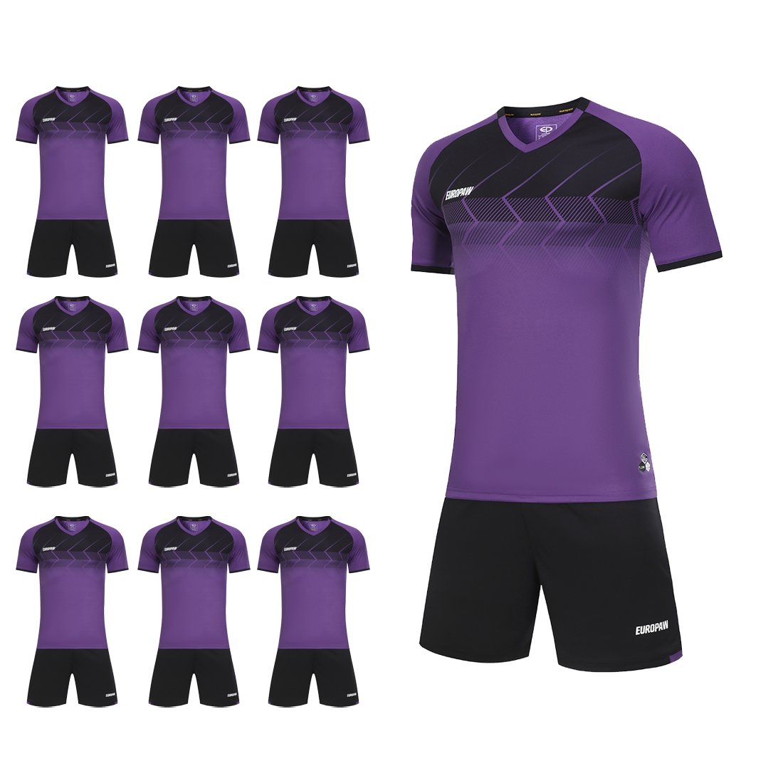 Футбольный набор на команду Europaw 029 фиолетовый-черный (10 шт) — превосходный выбор футбольной формы на команду для соревнований, тренировок и матчей. Этот набор идеально подходит как для взрослых команд, так и в качестве футбольной формы для детей. Стильный спортивный дизайн, возможность нанесения номеров и логотипов делают этот комплект идеальным решением для командной экипировки.